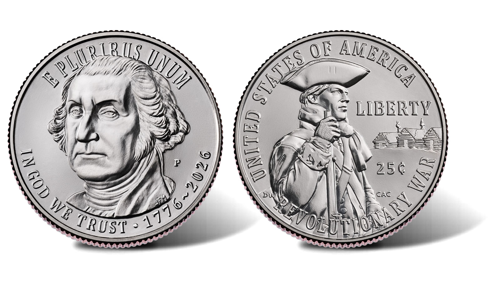 The reverse design shows a Continental Army soldier at Valley Forge, Pennsylvania. Washington’s forces endured defeat at the Battle of Brandywine and faced disease and extreme cold during their winter encampment from 1777 to 1778. Independence had been declared the previous July, but the Second Continental Congress was forced to flee Philadelphia to evade a British attack. The soldier’s resolute gaze shows his will to overcome the trials of the war in pursuit of liberty. The inscriptions are "UNITED STATES OF AMERICA," "LIBERTY," "25¢," and "REVOLUTIONARY WAR."