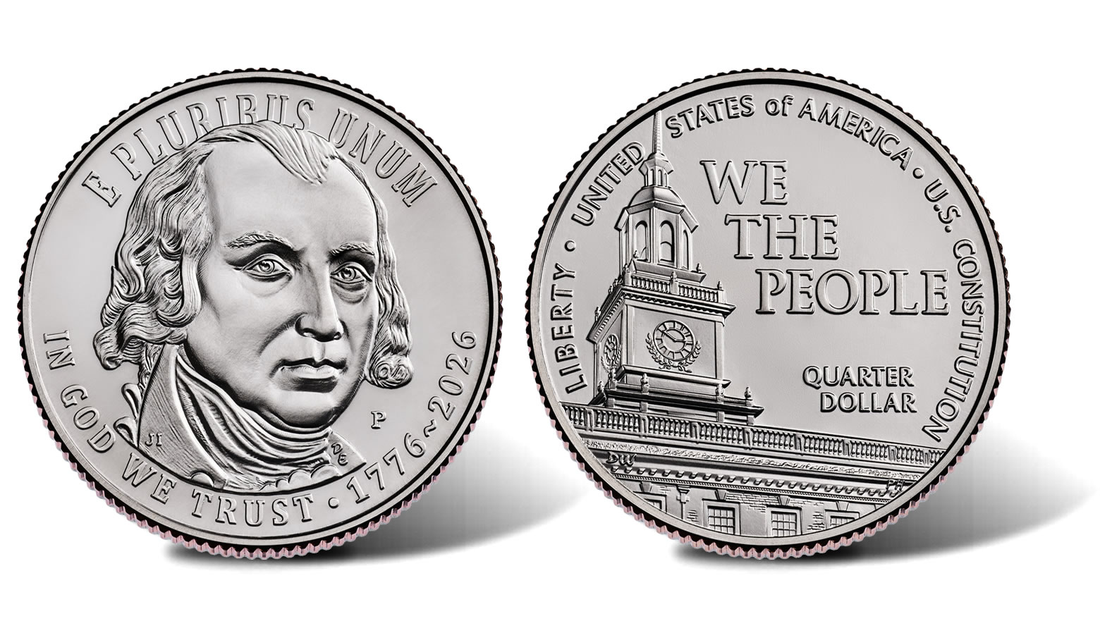 The reverse design depicts Independence Hall in Philadelphia, where the Liberty Bell was housed and where both the Declaration and U.S. Constitution were written, debated, and signed. The inscription "WE THE PEOPLE" and the image of Independence Hall together highlight a founding principle laid out in the Constitution: specifically, that our government is grounded in the consent of the governed. The inscriptions are "UNITED STATES OF AMERICA," "WE THE PEOPLE," "LIBERTY," "U.S. CONSTITUTION," and "QUARTER DOLLAR."
