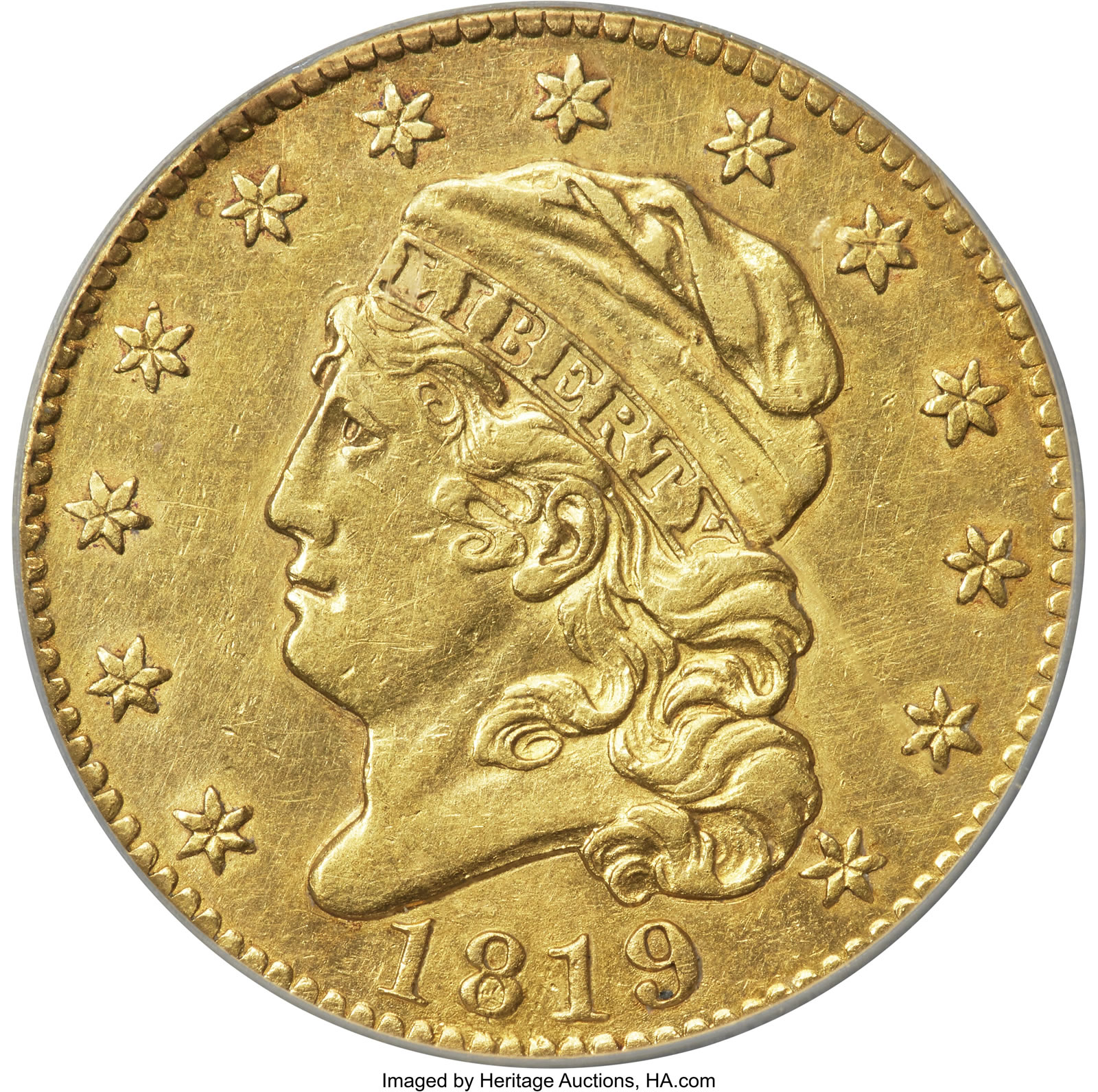 An 1819 "BD-3" Half Eagle, AU Details HBJ-252 is a magnificent recent discovery last offered at Heritage in 2014, not recorded in the Bass-Dannreuther reference. Heritage’s Borckardt is credited with the March 2014 identification of the variety, although Edgar Adams cited a third variety in his notes, suggesting he might have discovered it. But his mid-1930s articles on the half eagles stopped with 1800 varieties and access to his notebooks is not readily available.