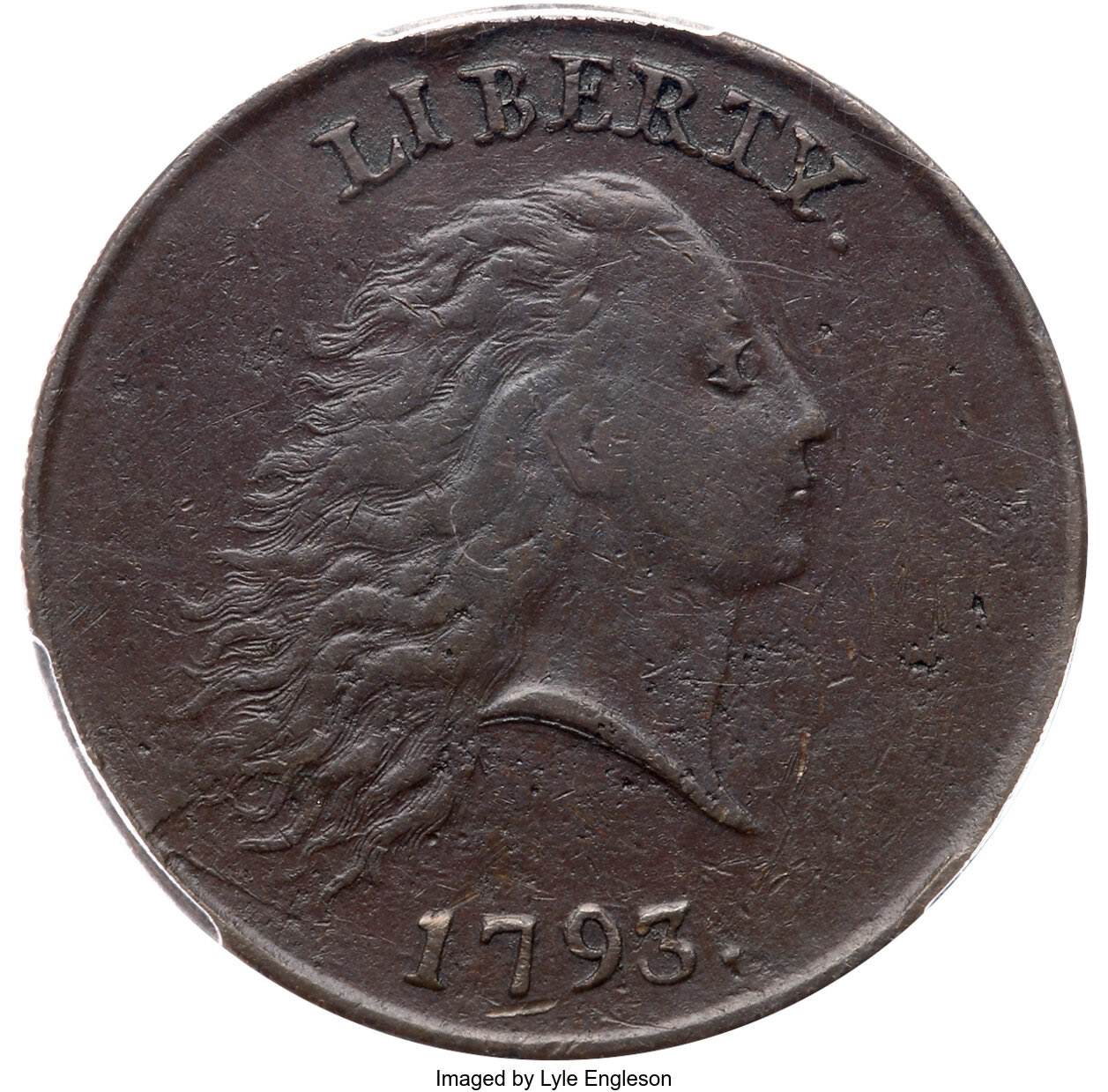 A 1793 1C S-5 R4 Wreath Cent, Vine & Bars Edge, Large LIBERTY, MS62 Brown PCGS is plated in Dr. Sheldon’s Early American Cents and Penny Whimsy. It is a choice cent, the only variety of the 1793 Wreath cent with a large LIBERTY, and it comes with an unbroken provenance that has been traced back over a century.