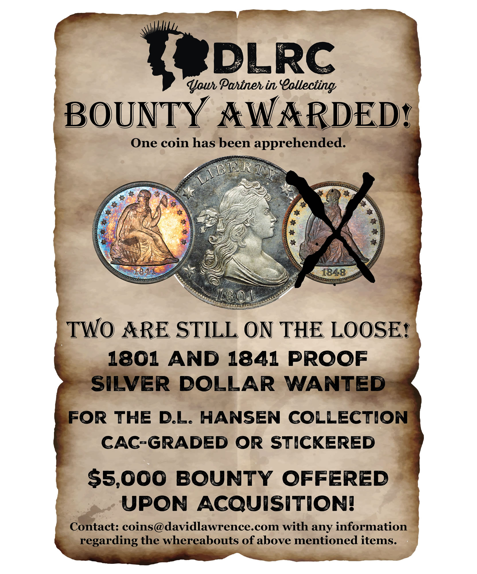 In August 2025, DLRC (formerly David Lawrence Rare Coins) posted a bounty on three Proof Silver Dollars on behalf of the D.L. Hansen Collection. The three coins — dated 1801, 1841, and 1848 — are the lone missing pieces from the Proof Silver Dollar Collection. After a protracted search of more than 6 years, the first of the three pieces has been tracked down!