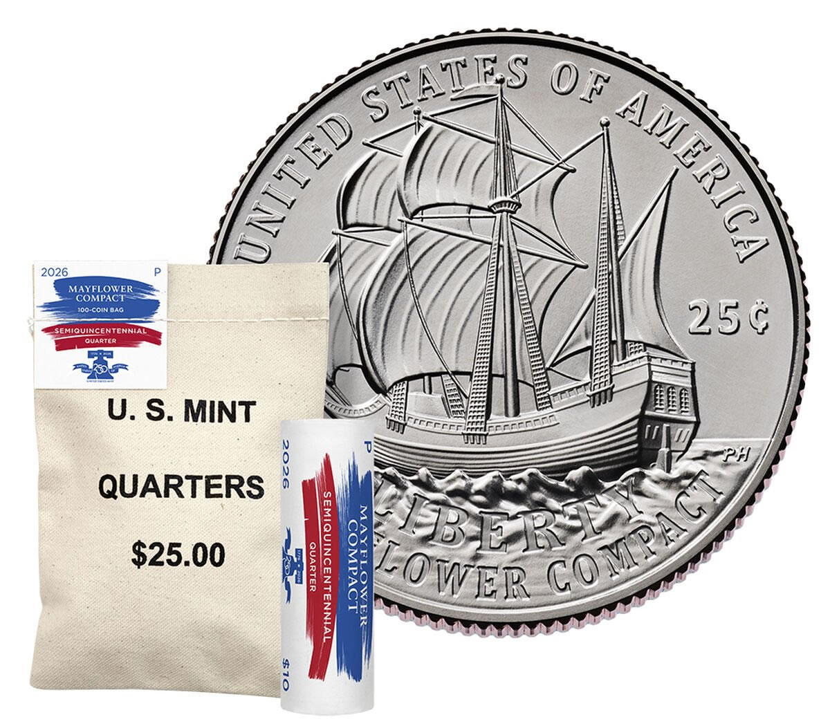 Mint image 2026 Semiquincentennial Mayflower Compact Quarter, Roll and Bag