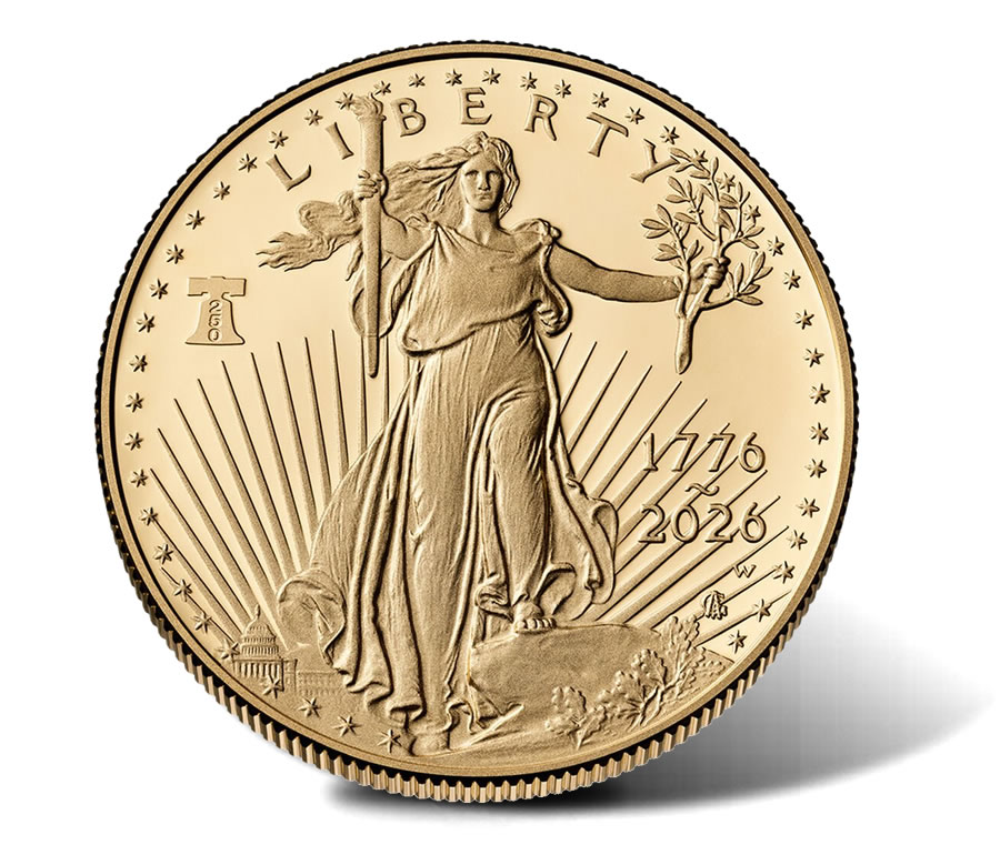 Offered individually are a $50 face value one-ounce eagle and fractional versions: a half-ounce piece with a $25 face value, a quarter-ounce piece with a $10 face value, and a tenth-ounce piece carrying a $5 face value. All are struck at the Mint’s West Point facility in 22-karat gold, composed of 91.67% gold, 3.0% silver, and the remaining balance copper.