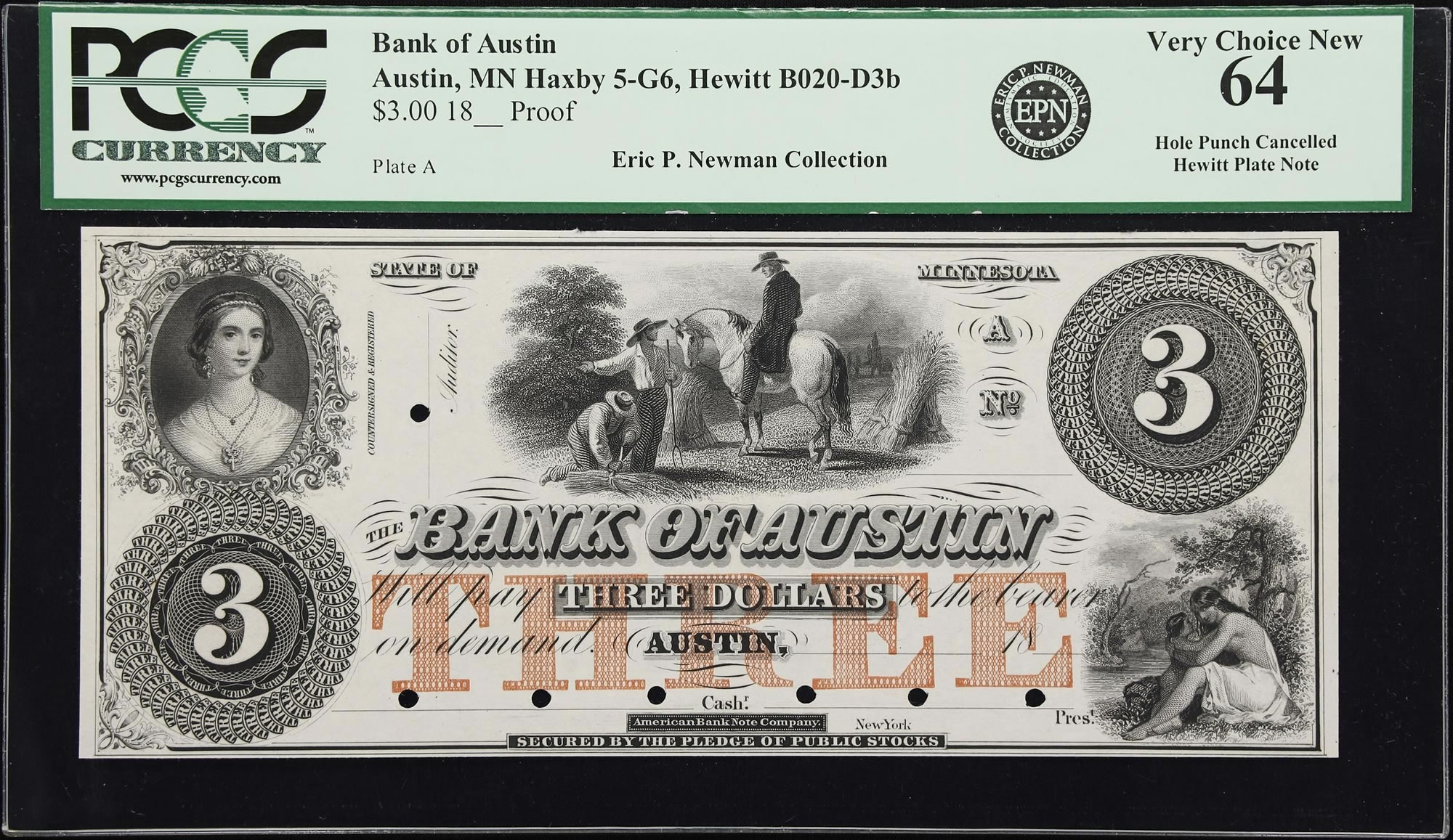 Notable items include a $3 Proof impression from the Bank of Austin (Lot 5120) and an issued note from the Bank of Germantown (Lot 5196) bearing the "White Bear" vignette engraved by DeWitt Clinton Hay after artwork by Felix O.C. Darley.