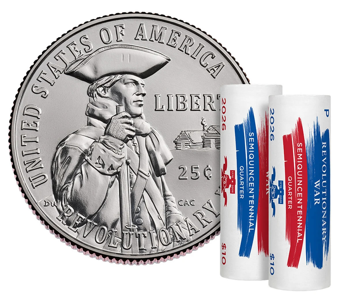 Rolls and bags of the second of five quarter dollars to be issued this year in celebration of the 250th anniversary of American independence debut today at noon ET with the release of the 1776 ~ 2026 Revolutionary War quarter.