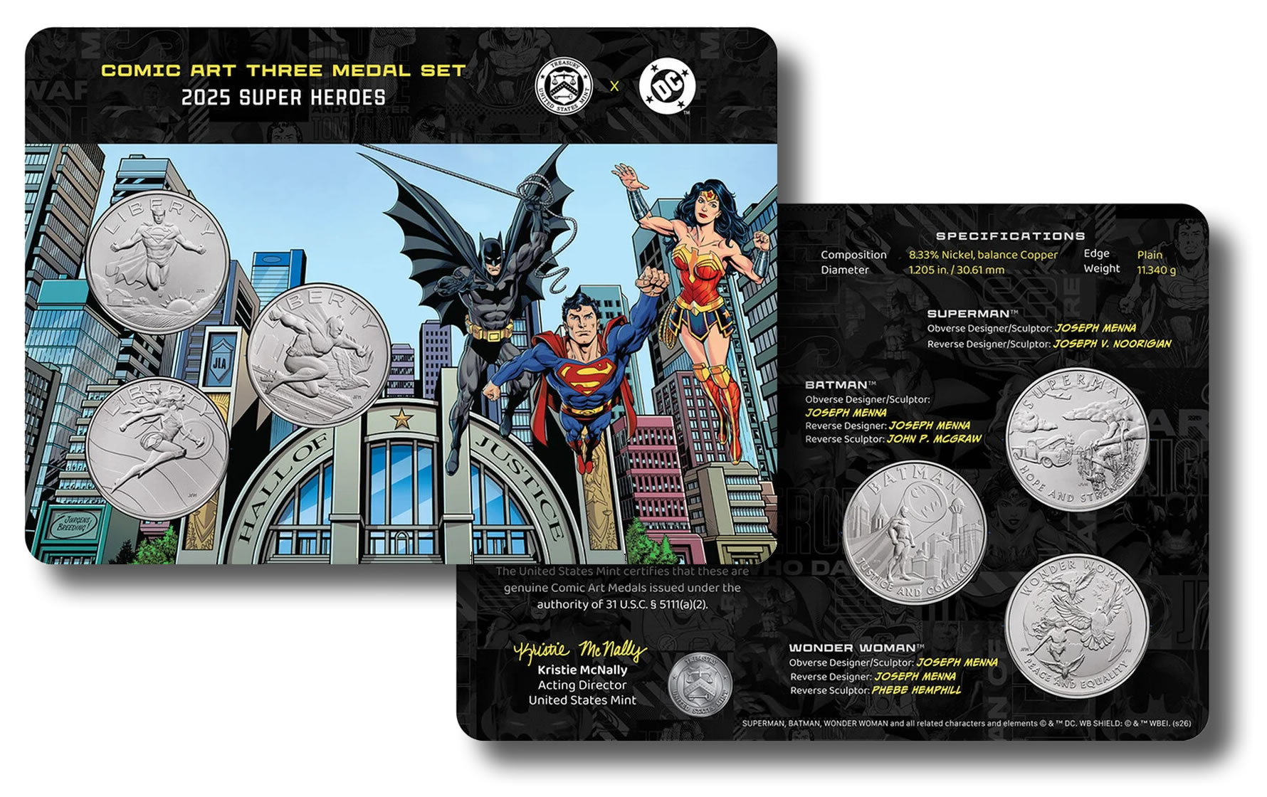 The set combines designs introduced earlier in 2025 as part of the Mint’s Comic Art Coin and Medal Program, a multi-year initiative created in collaboration with Warner Bros. Discovery that highlights the ideals of DC Super Heroes and the American values they represent.