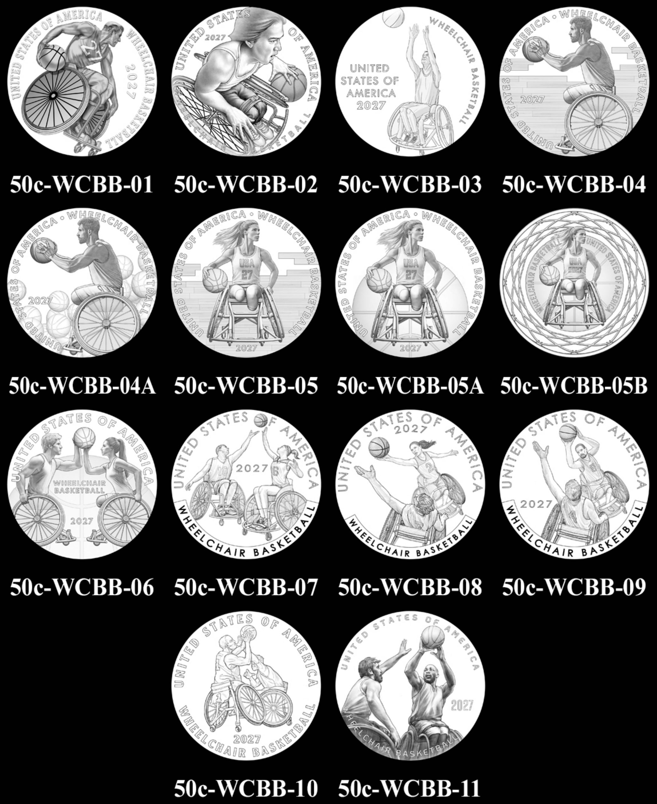 Against that backdrop, the two panels again split, with the CCAC recommending reverse #1 and suggesting that the ball be changed to a Molten, the sport’s official game ball. The CFA backed reverse #7, praising its "superior legibility and dynamic image," while also calling for removal of the border and "Wheelchair Basketball," moving the 2027 date to the lower left, and more fully depicting the wheels.