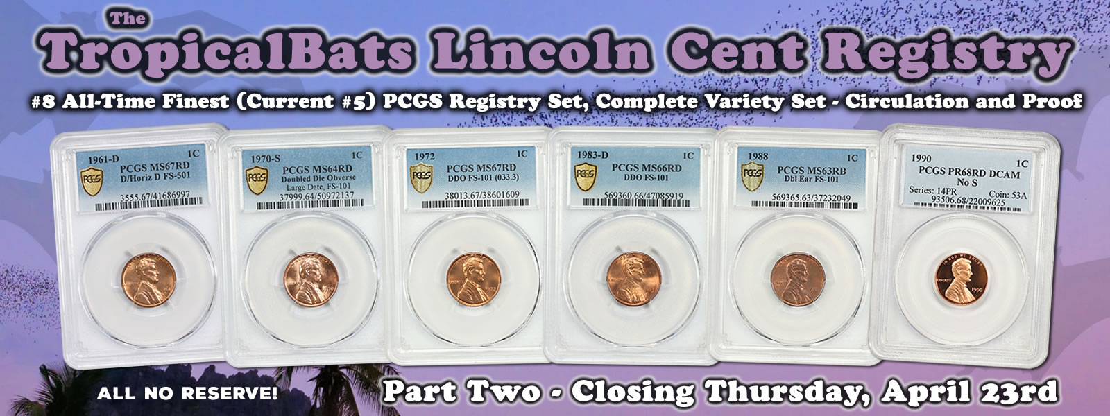 DLRC is offering the TropicalBats Registry Set — a high-ranking Lincoln cent collection — across two consecutive Red Carpet Rarities auctions now underway, with closings scheduled for April 16 and April 23.