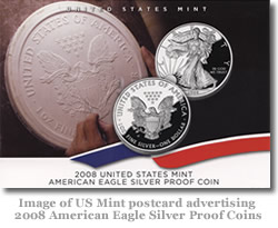 It’s a good idea to subscribe to the Mint’s e-mail or mailing list. They’re generally activate in marketing their latest offerings. For example, the Mint sent an e-mail and delivered postcard announcements reminding subscribers in 2008 that the American Eagle Silver Proof coin would be available for $31.95, plus shipping and handling.