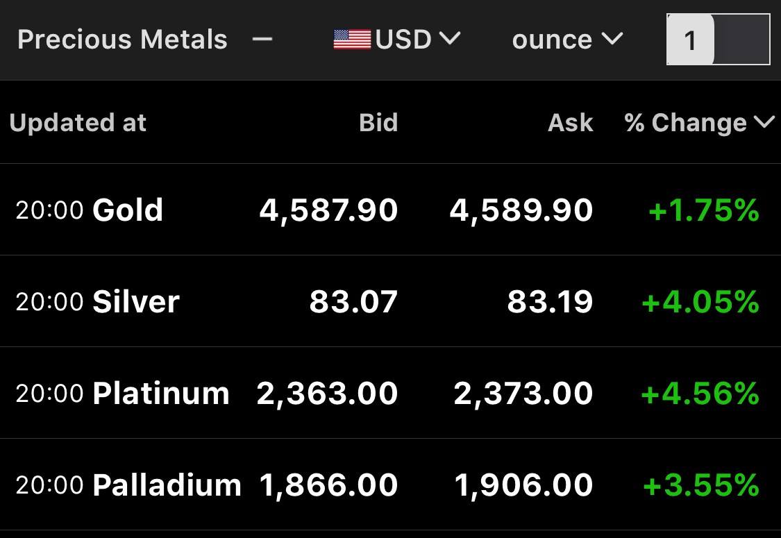 Silver, Gold, Platinum & Palladium Prices
