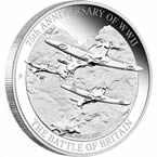 The coin’s reverse portrays three Hawker Hurricane fighter aircraft flying through the sky during the Battle of Britain. Learn More » |
